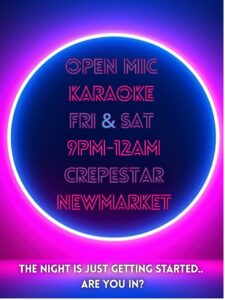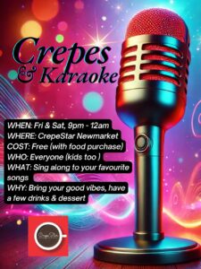 Join us every Friday and Saturday from 9 PM to 12 AM at CrepeStar Newmarket for Crepes & Karaoke Night! Free entry, fantastic desserts, drinks, and all the fun of singing your favorite tunes in a lively atmosphere. Everyone’s welcome—bring your friends and good vibes!